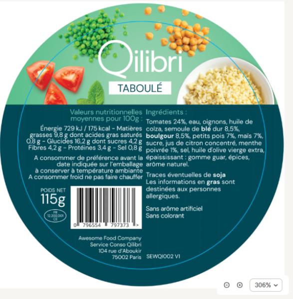 Salade : Tomates 24%, eau, oignons, huile de colza, semoule de blé dur 8,5%, boulgour 8,5%, petits pois 7%, maïs 7%, sucre, jus de citron concentré, menthe poivrée 1%, sel, huile d'olive vierge extra, épaississant : gomme guar, épices, arôme naturel.